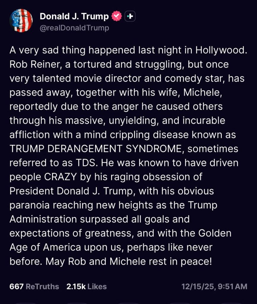 UNILAD – Trump slammed for ‘disgusting and shameful’ tribute to Rob Reiner and wife after ‘apparent homicide’