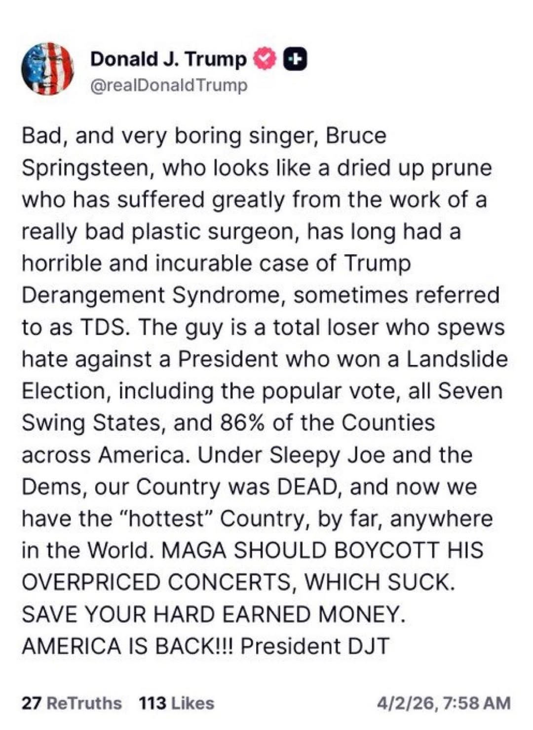 The President of the United States woke up this morning and posted a 150-word personal attack on Bruce Springsteen.