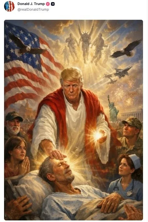 Trump posted this meme, which looks to be him as a heavenly figure, blessing a character that looks just like Jeffery Epstein, the dead pedophile.